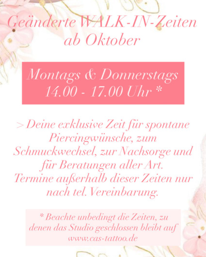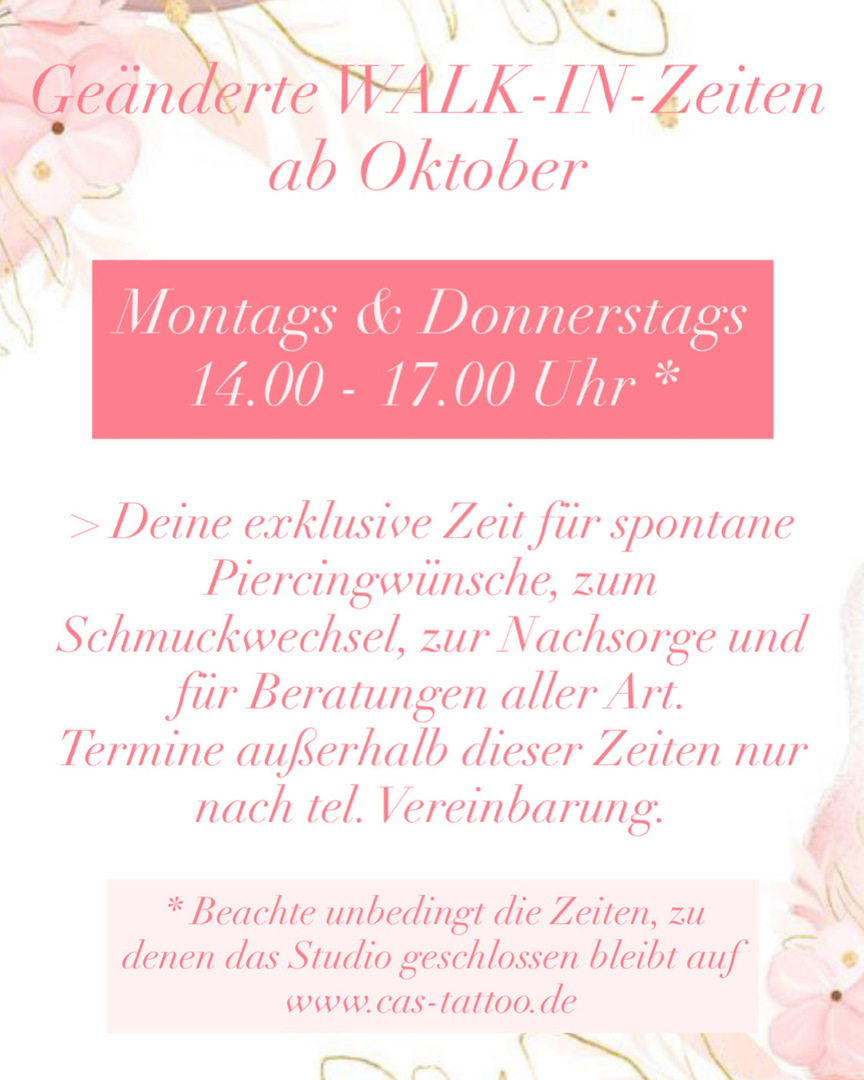 Zu meinen Walk-in-Zeiten kannst Du unangemeldet und spontan zum Piercen, Schmuckwechsel, zur Beratung u. Terminvereinbarung etc. vorbeikommen. Diese Zeiten sind nicht fest, sondern wechseln stetig, je nach Tattooterminlage, und werden regelmäßig hier auf meiner Homepage und in meinen Instagram- u. Facebookposts u. -storys gepostet. Ruf mich auch gern im Studio an, solltest Du einen Termin außerhalb der Walk-in-Zeiten buchen wollen.